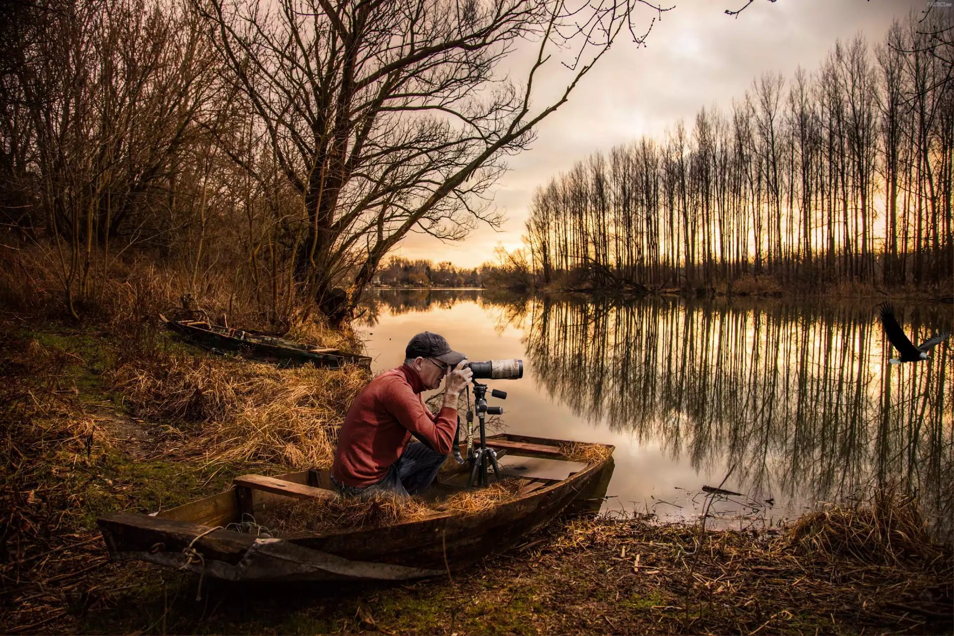 Jesień, Mężczyzna, Stara, Jezioro, Drzewa, Łódka, Aparat